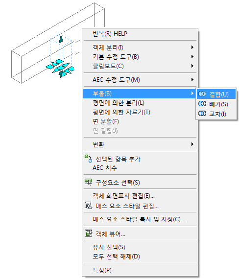 본체 수정자를 내부에서 편집하는 동안 그립으로 수정자 쉐이프를 변경하고 부울 명령을 사용하여 본체 수정자에서 다른 객체를 추가 또는 제거할 수 있습니다.