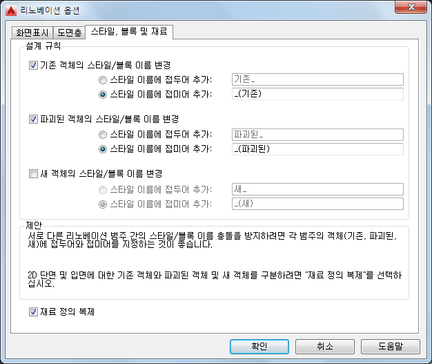 - 원하는 리노베이션 범주를 선택하고 현재 도면의 스타일/블록 이름에 추가할 접두어 또는 접미어를 지정합니다.