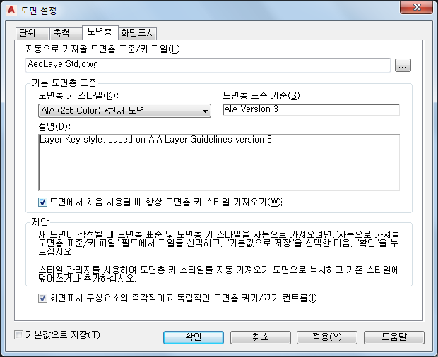| 현재 도면에 대한 도면층 설정만 저장 | 기본값으로 저장을 선택 해제하고 적용을 클릭한 다음 확인을 클릭합니다. |