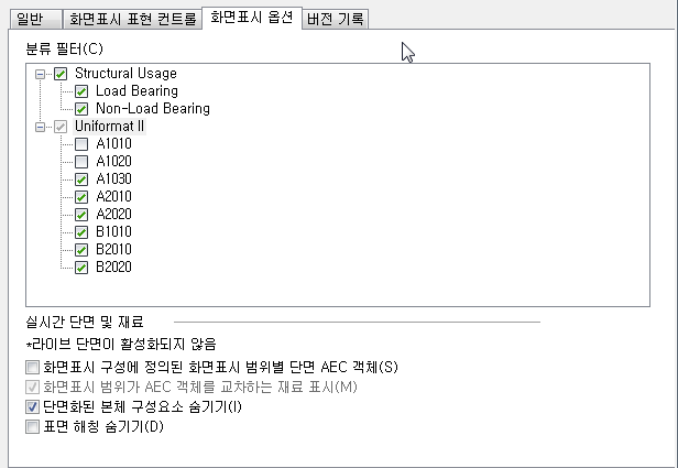 예를 들어, A1010 및 A1020으로 분류된 모든 문과 벽을 숨기려면 Uniformat II 아래의 A1010 및 A1020 확인란을 선택 해제합니다.