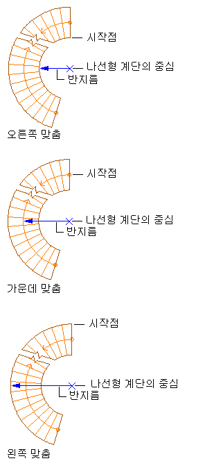 반지름은 나선형 계단의 중심점에서 선택된 자리맞추기 점까지 측정됩니다.