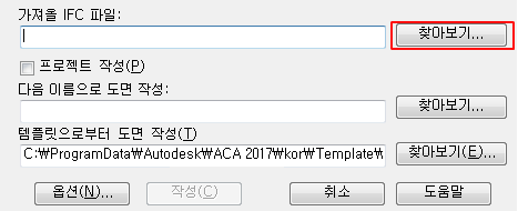 IFC 파일 가져오기 및 도면 작성 대화상자의 가져올 IFC 파일에서 찾아보기를 클릭합니다.