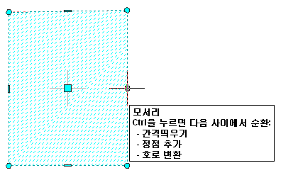 | 선택된 모서리를 호로 변경 | Ctrl 키를 두 번 눌러 호로 변환 편집 모드로 전환합니다. 중간점을 원하는 위치로 신축하고 한 번 클릭하거나 값을 입력하고 Enter 키를 누릅니다. |