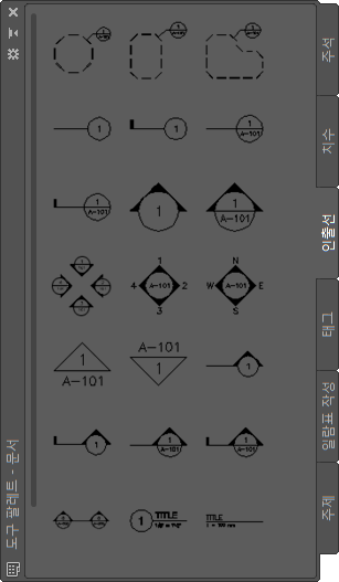 제목 표식을 선택적으로 삽입할 수 있는 직사각형 경계의 상세 인출선 도구. 인출선 기호에는 상세를 시트에 배치할 때 해석되는 시트 번호와 상세 번호에 대한 필드 자리 표시자가 있습니다. |