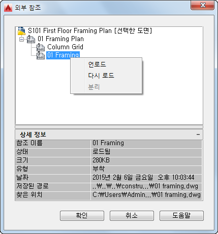 상황에 맞는 메뉴에서 부착된 외부 참조를 언로드, 다시 로드 또는 분리할 수 있습니다.