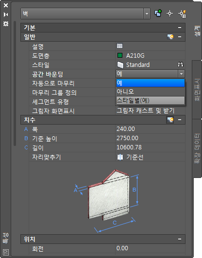 주: AutoCAD, Civil 3D 또는 Land Desktop과 같은 AutoCAD Architecture Object Enabler 환경에서 도면을 열거나 AutoCAD Architecture를 AutoCAD로 실행하는 경우 공간 바운딩 특성이 표시되지 않습니다. 이 특성은 AutoCAD Architecture 또는 AutoCAD MEP의 전체 설치에서만 표시됩니다.