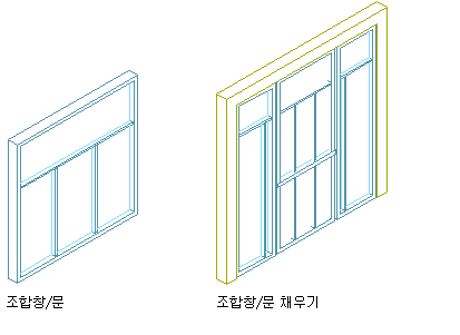 조합창은 커튼월 단위와 유사하게 작동하지만 패널 채우기나 문 또는 창과 같은 객체가 포함될 수 있습니다. 조합창/문은 커튼월 및 표준 벽에 삽입할 수 있습니다.