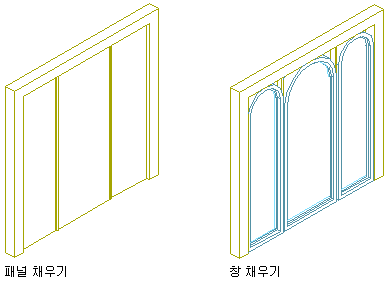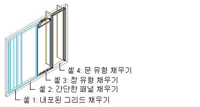 그리드의 각 셀에는 석재 칸막이 벽 또는 글래이징 등과 같은 기본 클래딩 재료를 나타내는 패널 채우기나 창 또는 문 등과 같은 객체가 포함될 수 있습니다.