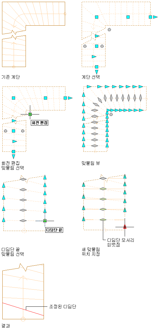 다음 절차에 따라 수동 - 디딤단 또는 수동 - 라이저 균형 돌음단 스타일이 지정된 계단의 개별 디딤단 끝을 이동하십시오. 각 디딤단 모서리 또는 라이저 면은 디딤단 모서리와 계단의 구성선이 교차하는 지점에 의해 설정된 점에서 피벗합니다. 디딤단 모서리 그립을 새 위치로 끌어 디딤단 모서리의 새 각도를 지정합니다.