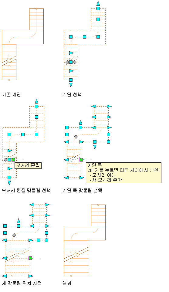 계단의 전체 모서리를 선택된 위치로 이동합니다. 또한 계단 입구 폭은 새 계단 폭에 맞게 변경됩니다.