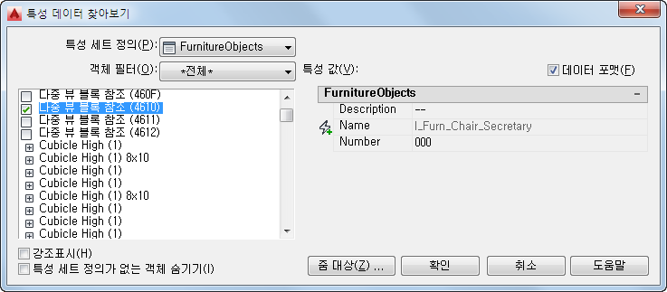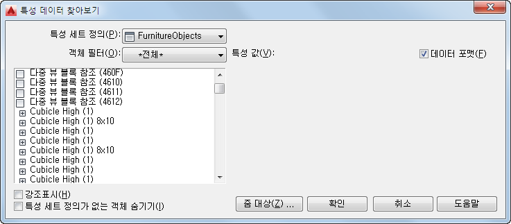 | 특성 세트가 부착된 객체 또는 스타일의 리스트 보기 | 객체 필터를 특성 세트에 적용합니다. 특성 세트를 부착할 수 있는 객체나 스타일을 변경할 수 있습니다. 강조를 선택한 경우 (직접 또는 스타일을 통해) 특성 세트가 부착된 객체가 도면에서 강조됩니다. |