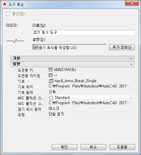 | AEC 폴리곤 스타일 | 끊기 표식에 마스크 특성을 사용할 것인지 지정합니다. 이 특성을 지정하지 않으면(--) 표준 스타일이 기본 스타일이 됩니다. |