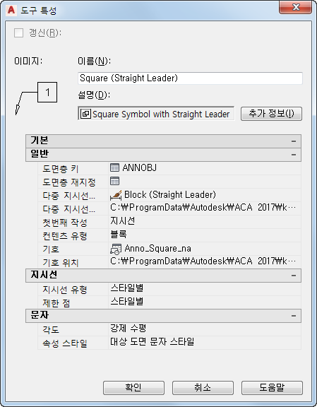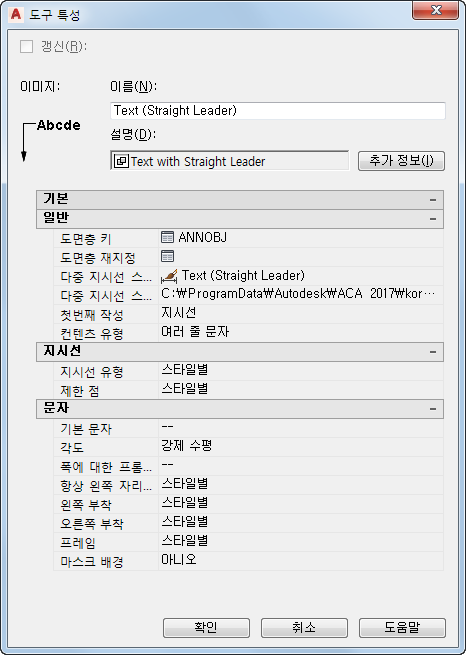 | 지시선/제한 점 | 지시선 유형이 지정된 경우에만 표시되는 특성이며, 지시선에서 점의 개수가 제한되는지 나타냅니다. 지정되지 않은(--) 경우, 현재 도면에 해당하는 지시선 설정이 사용됩니다. |