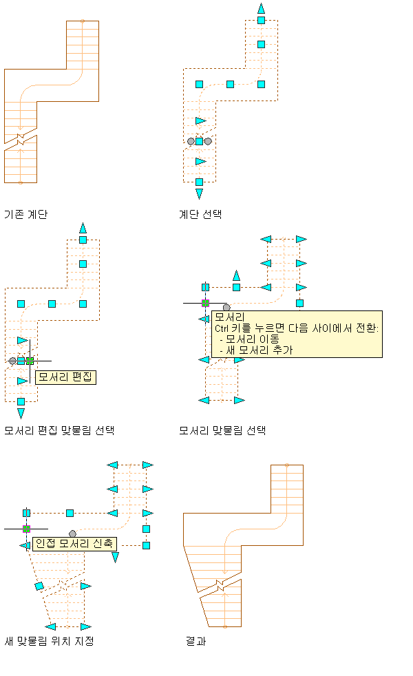 그립이 있는 계단참에 디딤단을 넣으면 계단참이 다른 방향으로 늘어나게 됩니다. 계단참에서 디딤단을 빼내도 계단참의 다른 끝에는 영향을 주지 않습니다. 계단은 맨 위까지 늘어나서 더 큰 계단참을 수용할 수 있게 됩니다. 계단 보행 경로 끝에서 맨 위와 맨 아래 그립으로 길이를 수정할 수 있습니다.