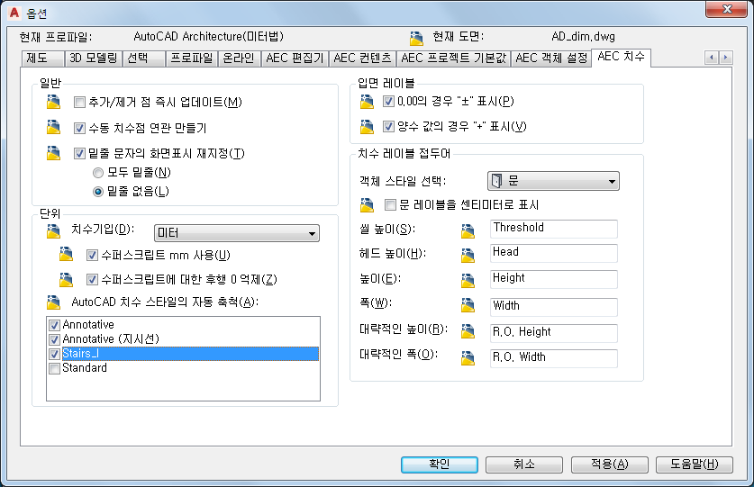 AEC 치수에 대한 설정에는 다음이 포함됩니다.