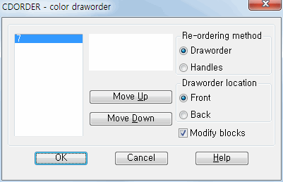 | Handles(사용되지 않음) | 도면 데이터베이스에서 객체를 재정리하여 선택한 객체의 그리기 순서를 정렬합니다. 객체가 삭제되고 해당 색상으로 지정되는 순서로 재작성됩니다. |