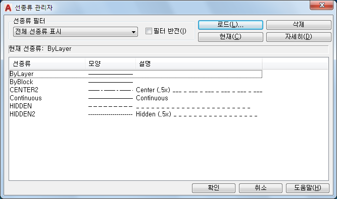 선택된 선종류를 현재 선종류가 되도록 설정합니다. 현재 선종류를 BYLAYER로 설정하는 것은 객체가 특정 도면층에 지정된 선종류를 사용함을 의미합니다. 선종류를 BYBLOCK으로 설정하는 것은 객체가 블록으로 그룹화될 때까지 CONTINUOUS 선종류를 사용함을 의미합니다. 블록을 삽입할 때마다 모든 객체는 블록의 선종류를 상속받습니다. CELTYPE 시스템 변수는 선종류 이름을 저장합니다.