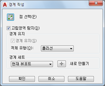 새 경계 객체의 유형을 조정합니다. BOUNDARY는 경계를 영역 또는 폴리선 객체로 작성합니다.