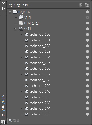 점 구름 프로젝트, 영역 및 스캔의 표시를 조정하는 데 사용되는 점 구름 관리자 팔레트를 표시합니다.