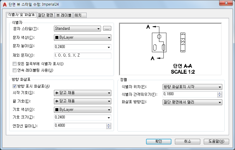 식별자 및 화살표 탭(단면 뷰 스타일 관리자)