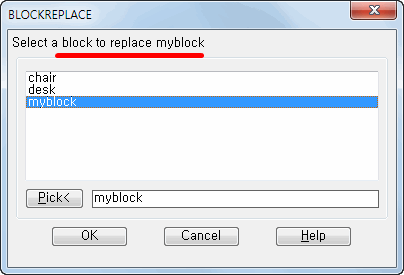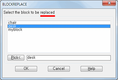 리스트에서 블록 이름을 선택하거나 선택 버튼을 클릭하고 도면에서 블록을 선택하여 검색할 블록 이름을 지정합니다.