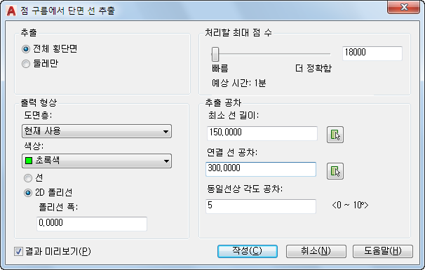 예상되는 단면 평면과 점 구름의 교차점을 따라 선 또는 2D 폴리선을 작성합니다.