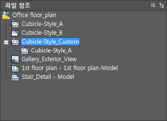 트리 뷰의 맨 위 단계에는 항상 현재 도면이 표시됩니다. 참조된 파일은 다음 단계에 표시됩니다. 자체적으로 내포된 파일 참조를 포함하는 참조된 파일을 열어 해당 하위 단계를 표시할 수 있습니다. 트리 뷰에서 선택할 때는 한 번에 하나의 파일 참조만 선택할 수 있습니다.