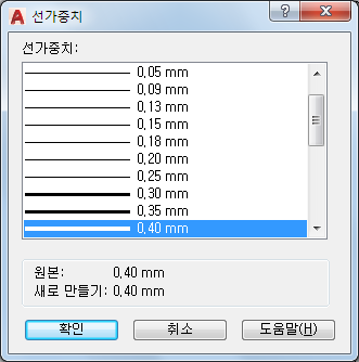 이전 선가중치를 표시합니다. 도면층이 작성될 경우 지정되는 기본 선가중치는 DEFAULT입니다(기본값인 0.01인치 또는 0.25mm로 플롯). (LWDEFAULT 시스템 변수)