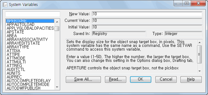 | Initial Value | 리스트 상자에 강조된 시스템 변수의 초기 값을 표시합니다. 이 값은 새 도면의 시스템 변수 값입니다. |
