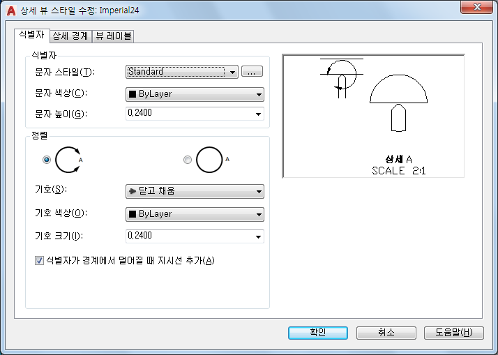 - 화살촉의 크기를 지정합니다. 상세 뷰 식별자가 상세 뷰 경계 외부에 배치된 경우에는 이 옵션을 사용할 수 없습니다.