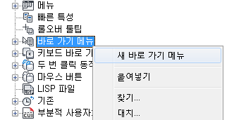 1. 사용자화 탭에 있는 <파일 이름>의 사용자화 창에서 바로 가기 메뉴 노드를 마우스 오른쪽 버튼으로 클릭합니다. 새 바로 가기 메뉴를 클릭합니다.