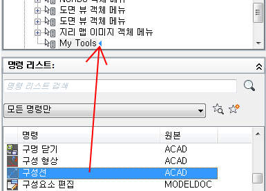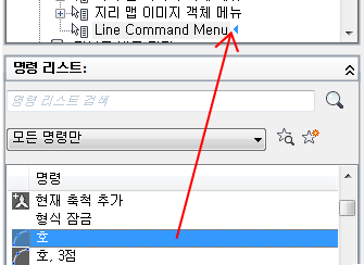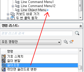 3. 바로 가기 메뉴에 추가할 명령을 명령 리스트 창에서 <파일 이름>의 사용자화 창으로 끕니다.