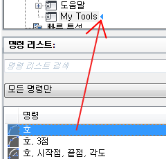 명령 리스트 창에서 명령을 풀다운 메뉴 또는 <파일 이름>의 사용자화 창에 있는 풀다운 메뉴 아래의 위치로 끕니다.