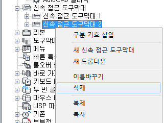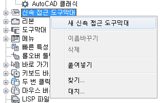 - 사용자화 탭에 있는 <파일 이름>의 사용자화 창에서 신속 접근 도구막대 노드를 마우스 오른쪽 버튼으로 클릭합니다. 새 신속 접근 도구막대를 클릭합니다.