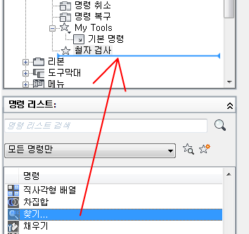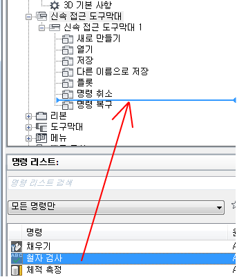 - 드롭다운 메뉴에 추가할 명령 또는 컨트롤을 명령 리스트 창에서 <파일 이름>의 사용자화 창으로 끕니다.