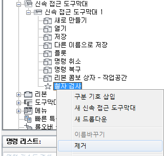 - 신속 접근 도구막대에 추가할 명령 또는 컨트롤을 명령 리스트 창에서 <파일 이름>의 사용자화 창으로 끕니다.
