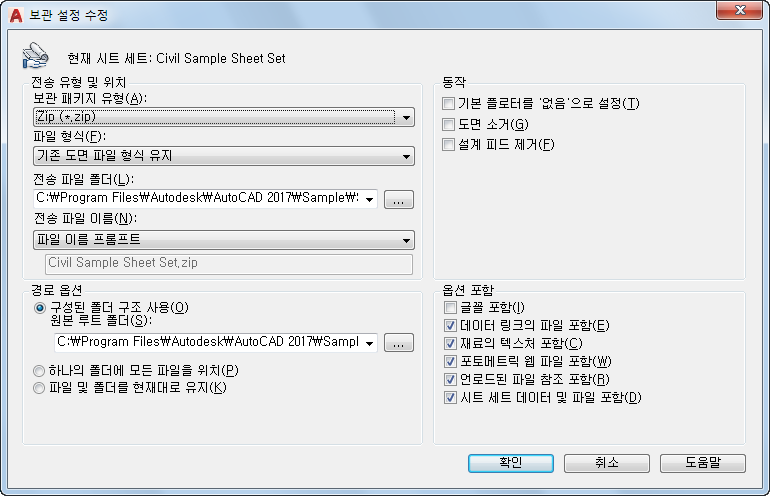 시트 세트 데이터(DST) 파일, 레이블 블록 도면 파일, 콜아웃 블록 도면 파일 및 도면 템플릿(DWT) 파일을 보관 패키지에 포함시킵니다.