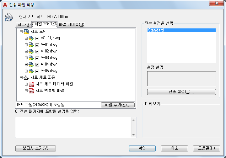 기본적으로 현재 도면과 연관된 모든 파일(예: 관련된 외부 참조, 플롯 스타일 및 글꼴)이 나열됩니다. 전송 패키지에 파일을 추가하거나 기존 파일을 제거할 수 있습니다. URL로 참조된 관련 파일은 전송 패키지에 포함되지 않습니다.