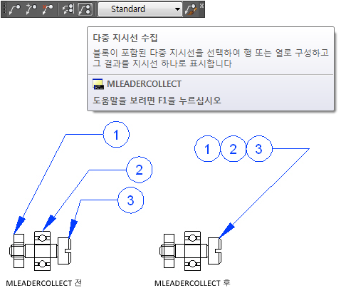 블록을 컨텐츠로 포함하는 다중 지시선 객체를 수집해서 하나의 연결선에 부착할 수 있습니다. MLEADERCOLLECT를 사용하여 도면에서 필요한 대로 다중 지시선을 수평이나 수직으로 또는 지정한 영역 내에서 수집할 수 있습니다.