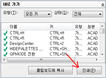 바로 가기 키 또는 임시 재지정 키의 리스트 인쇄