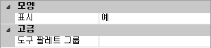 - 특성 창의 모양, 표시 상자에서 드롭다운 리스트를 클릭하고 예를 선택합니다.