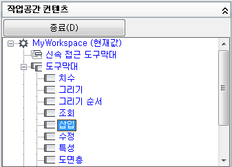 - 작업공간 컨텐츠 창에서 도구막대 노드 옆에 있는 더하기 기호(+)를 클릭하여 노드를 확장합니다.
