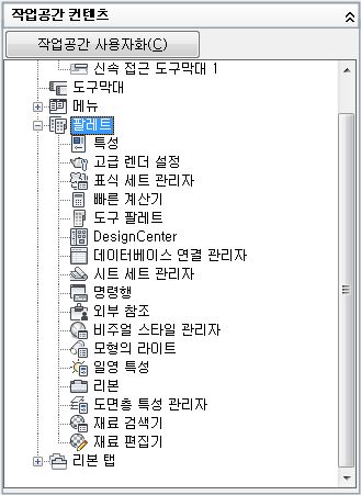 - 사용자화 탭에 있는 <파일 이름>의 사용자화 창에서 작업공간 노드 옆에 있는 더하기 기호(+)를 클릭하여 노드를 확장합니다.