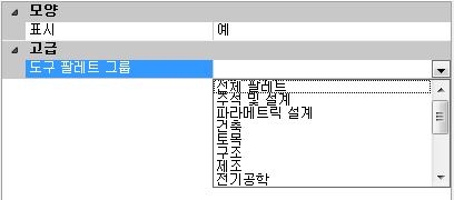 - 도구 팔레트 그룹 상자에서 나열된 도구 팔레트 그룹 중 하나를 선택하여 리본 탭과 연관시킵니다.