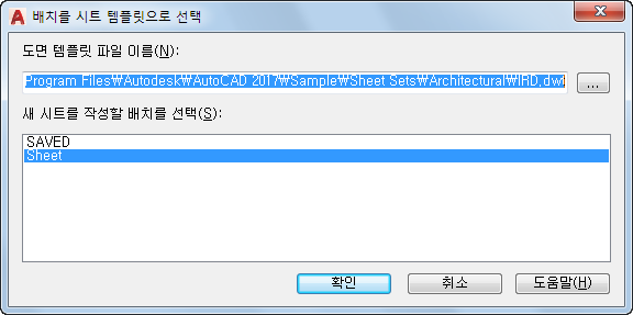 새 시트에 사용할 도면 템플릿 파일의 배치 이름을 나열하고 지정합니다.