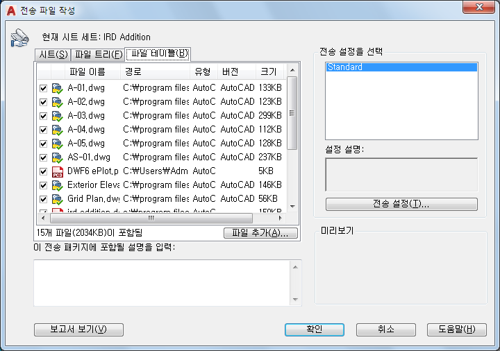 기본적으로 현재 도면과 연관된 모든 파일(예: 관련된 외부 참조, 플롯 스타일 및 글꼴)이 나열됩니다. 전송 패키지에 파일을 추가하거나 기존 파일을 제거할 수 있습니다. URL로 참조된 관련 파일은 전송 패키지에 포함되지 않습니다.