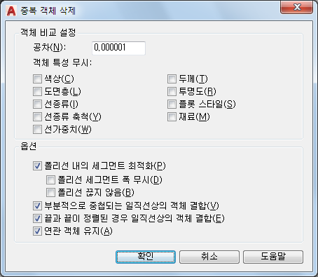 이 설정을 사용하여 OVERKILL에서 선, 호 및 폴리선을 처리하는 방법을 조정합니다.