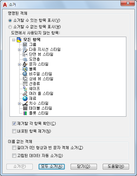 이러한 객체의 대부분은 현재 도면에서 사용되고 있거나 제거할 수 없는 기본 항목입니다.