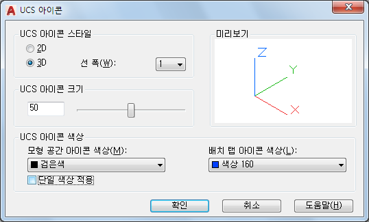 2D 또는 3D UCS 아이콘의 표시와 그 모양을 지정합니다.
