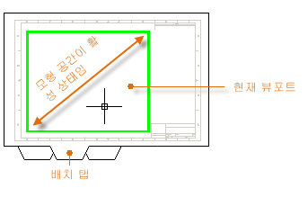 배치 뷰포트는 모형 공간의 축척된 뷰를 표시하기 위해 도면 공간에서 작성되는 객체입니다. 이를 모형 공간의 일부를 표시하는 폐쇄 회로 TV 모니터로 간주할 수 있습니다. 그림에서 모형 공간은 활성 상태이고 현재 배치 뷰포트 내에서 모형 공간에 액세스할 수 있습니다.